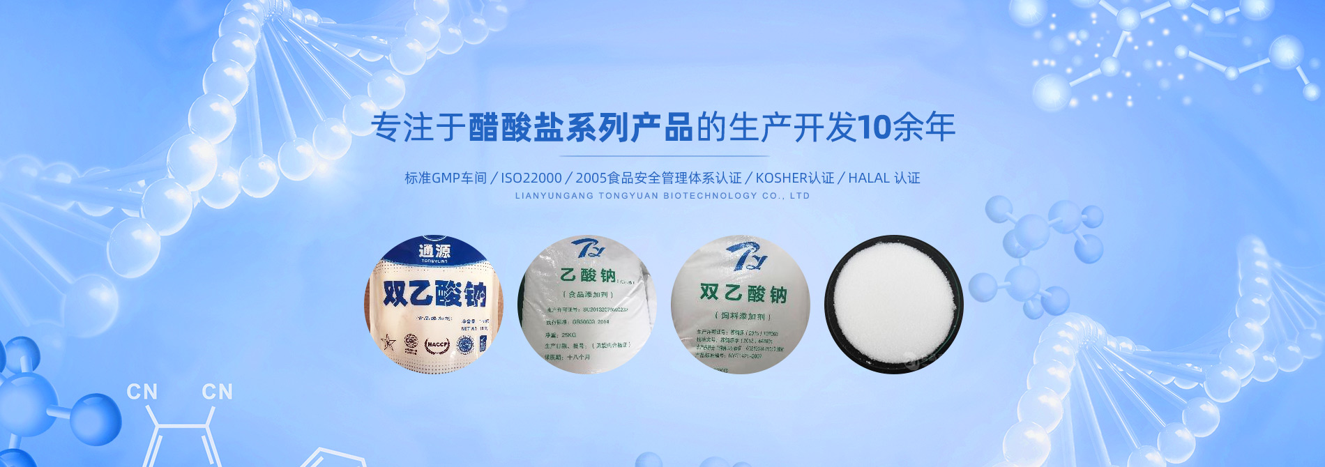 連云港市通源生物科技有限公司 是生產(chǎn)雙乙酸鈉、無水醋酸鈉、三水醋酸鈉、醋酸鉀、乙酸鈉、丙酸鈉、丙酸鈣和氯化鉀等系類醋酸鹽產(chǎn)品的專業(yè)制造商。公司專注于醋酸鹽系列產(chǎn)品的生產(chǎn)開發(fā)10余年,是國內(nèi)專業(yè)醋酸酸鹽產(chǎn)品生產(chǎn)基地。 目前,我們已和全球30多個國家和地區(qū)建立長期的業(yè)務合作關系,是中國較大的雙乙酸鈉生產(chǎn)商和出口商之一。作為中國食品添加劑和配料協(xié)會理事單位,通源公司已建成標準GMP車間5000余平方米,通過了ISO22000:2005食品安全管理體系認證、KOSHER認證、HALAL 認證等,這些都是我們提供高質(zhì)量產(chǎn)品和優(yōu)良服務的前提和確保。 生產(chǎn)出色產(chǎn)品,提供優(yōu)良服務,滿足顧客需要,是我們努力的目標。愿和我們的朋友們攜手,共...